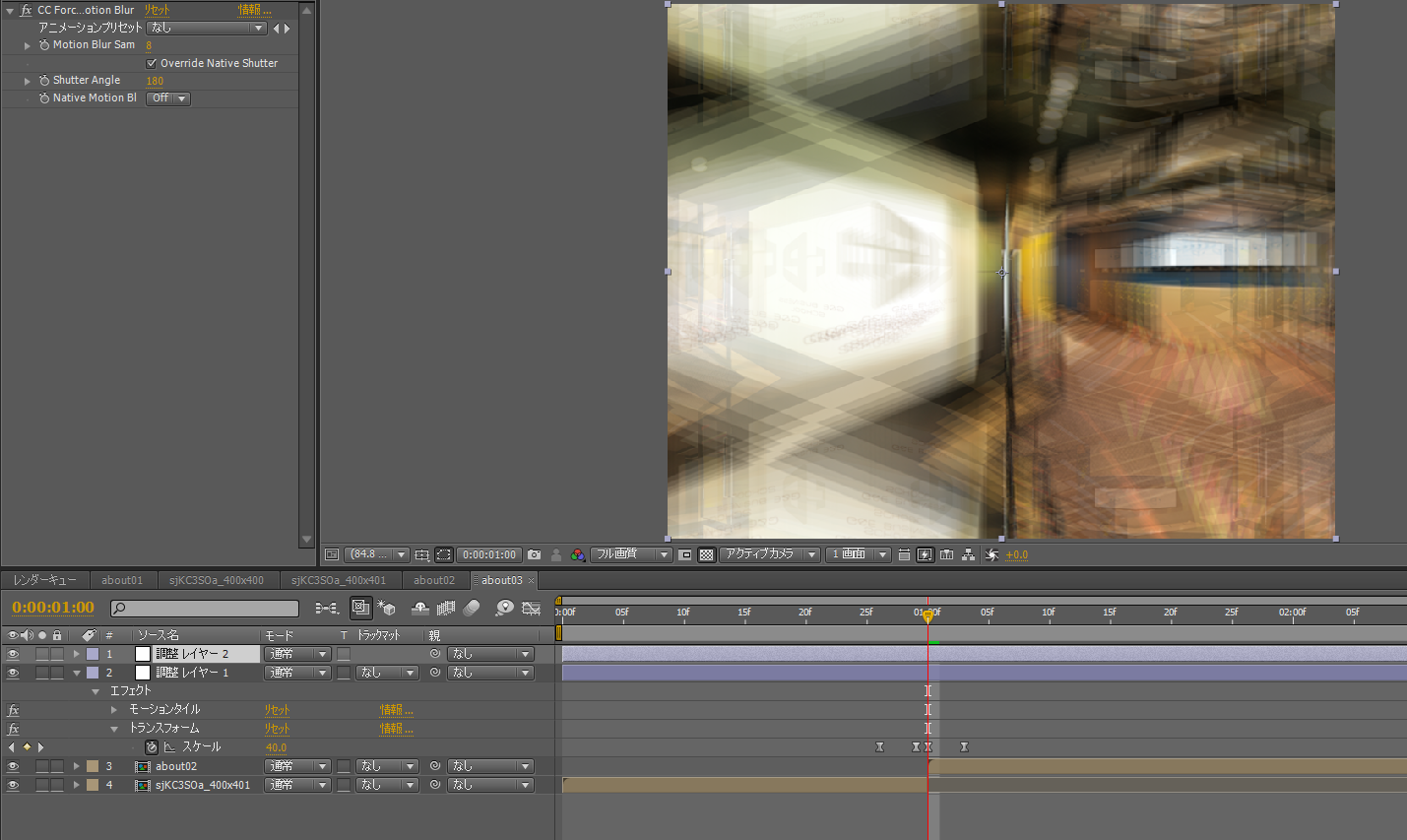 現状、モーションタイルを入れた部分がハッキリ見えている為、エフェクト「CC Force Motion Blur」を適用します。